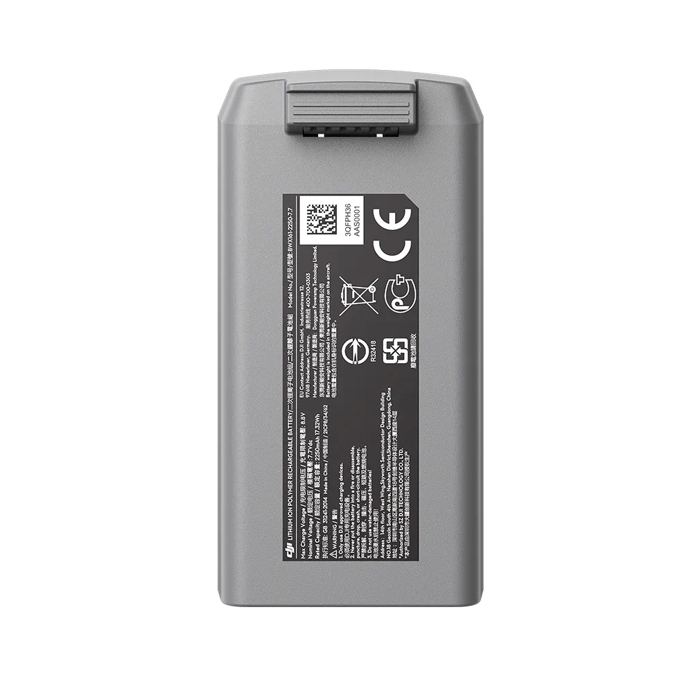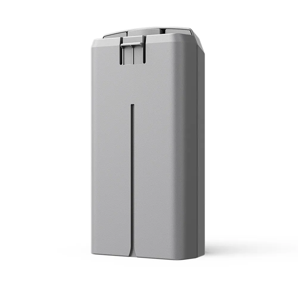 Bateria de voo inteligente LiPo 2S 2250 mAh 17,3W para DJI Mini 2, DJI Mini 2 SE (até 31 minutos) e DJI Mini SE (até 30 minutos) com alta densidade de energia que reduz o peso total e estende o tempo máximo de voo. Possui um sistema de gerenciamento que é possível monitorar em tempo real o nível de bateria, com proteção contra sobrecarga e descarga excessiva.