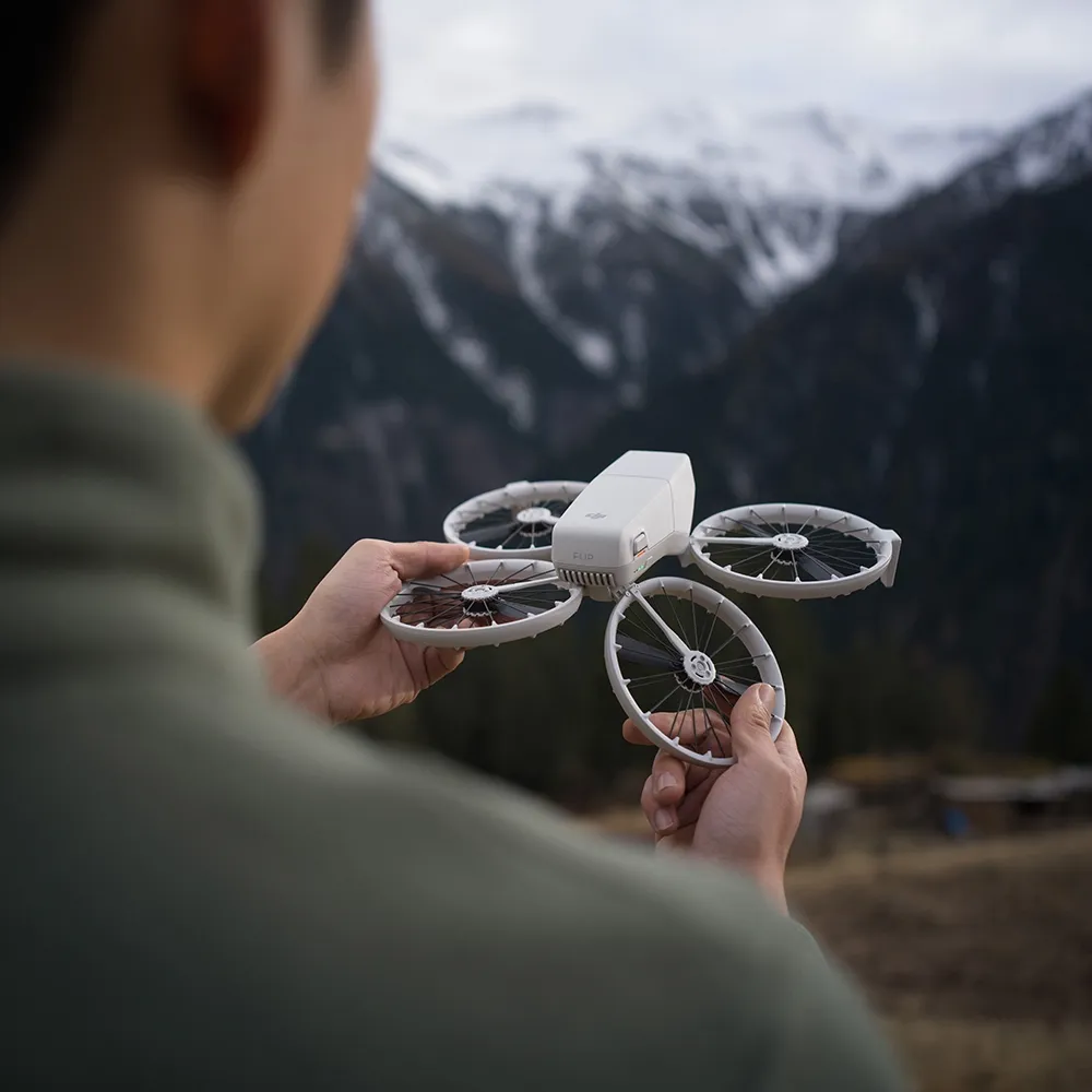 O DJI Flip é o primeiro drone da DJI equipado com um protetor de hélices dobráveis com proteção completa. [5] O protetor possui uma estrutura de suporte em fibra de carbono que pesa apenas 1/60 do peso do material tradicional de policarbonato (PC), mantendo a mesma rigidez. Esse design leve e durável oferece uma proteção ampla, garantindo que até mesmo pilotos iniciantes possam navegar pelos céus com confiança.